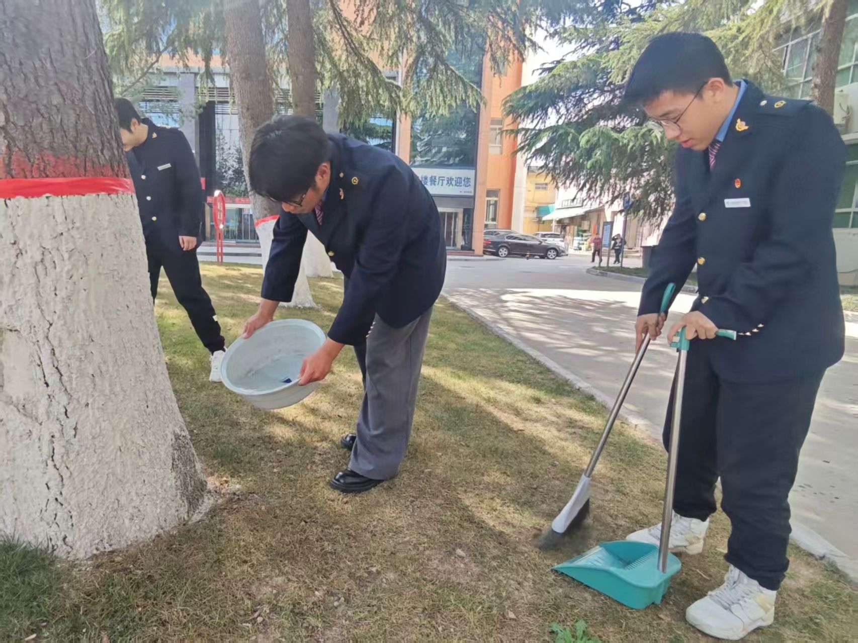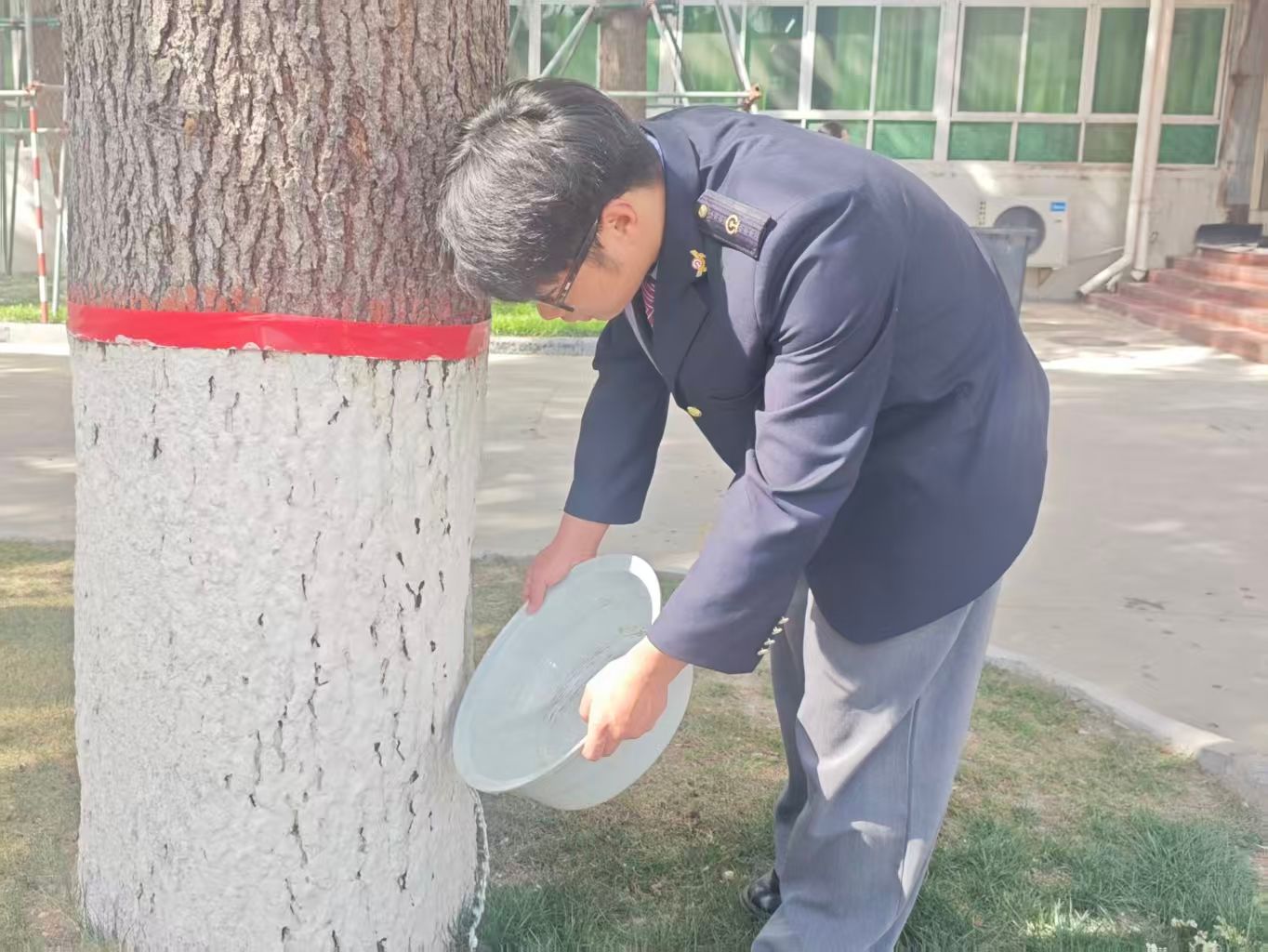 铁道通信2501团支部的团员身着制服走进校园,通过为树木浇水、清扫周边环境等志愿服务,以实际行动践行爱校护绿责任,展现了新时代青年学子的奉献精神与集体担当。