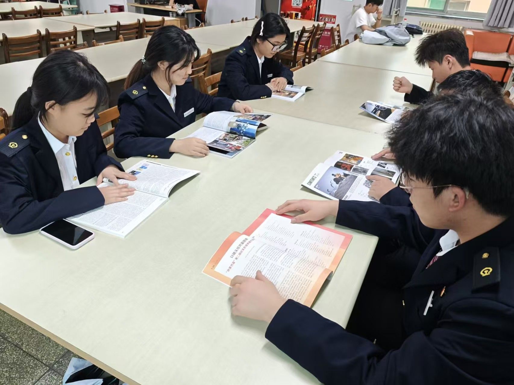 通号设备2402团支部的团员身着制服齐聚阅览室,围坐共读红色理论读本与行业专业书籍,在沉浸式阅读中汲取思想养分、夯实专业基础,交流分享环节中大家结合专业学习与职业规划畅谈感悟,进一步坚定了立足岗位、锤炼本领、服务铁路事业的青春信念。