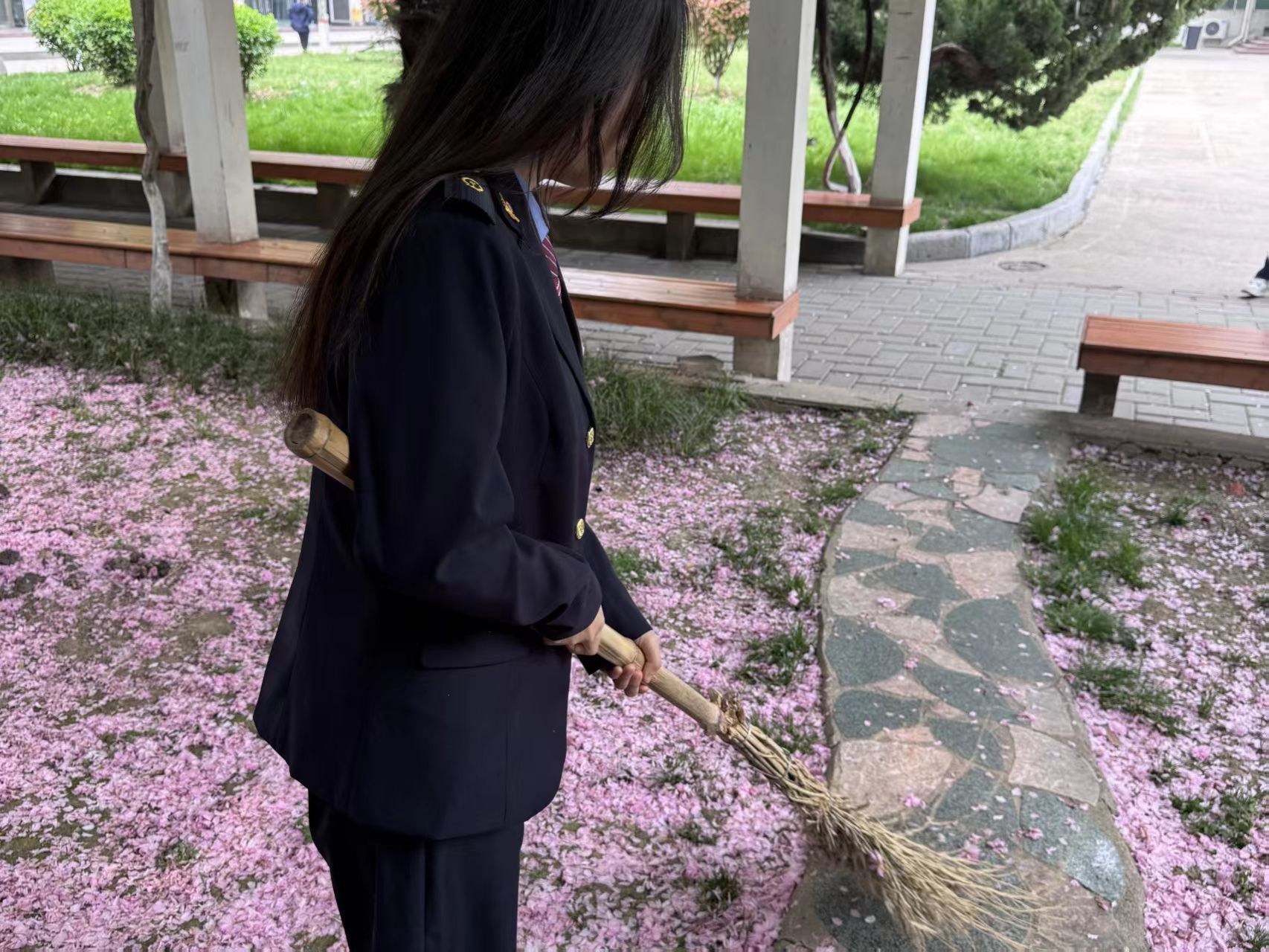 计算机2501团支部的团员身着制服走进校园,在草坪中捡拾落花、在长椅上共同创作春日手作,用双手呵护校园绿意、定格春日美好。大家分工协作、互帮互助,既以实际行动践行了爱校护绿的责任,也在创意实践中增进了集体凝聚力,展现了新时代青年学子热爱校园、积极向上的精神风貌。