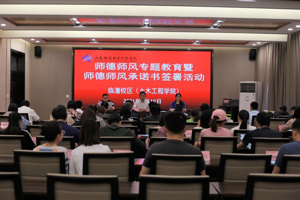 为深入贯彻落实《教师法》《高等学校教师职业道德规范》《新时代高校教师职业行为十项准则》等法律法规精神要求,进一步加强临潼校区师德师风建设。5月19日下午,临潼校区组织全体专任教师开展师德师风专题教育暨师德师风承诺书签署大会。临潼校区主任熊奇,副主任王秀丽、朱栋夫,校区59名专任教师参加此次大会,会议由校区主任熊奇主持。