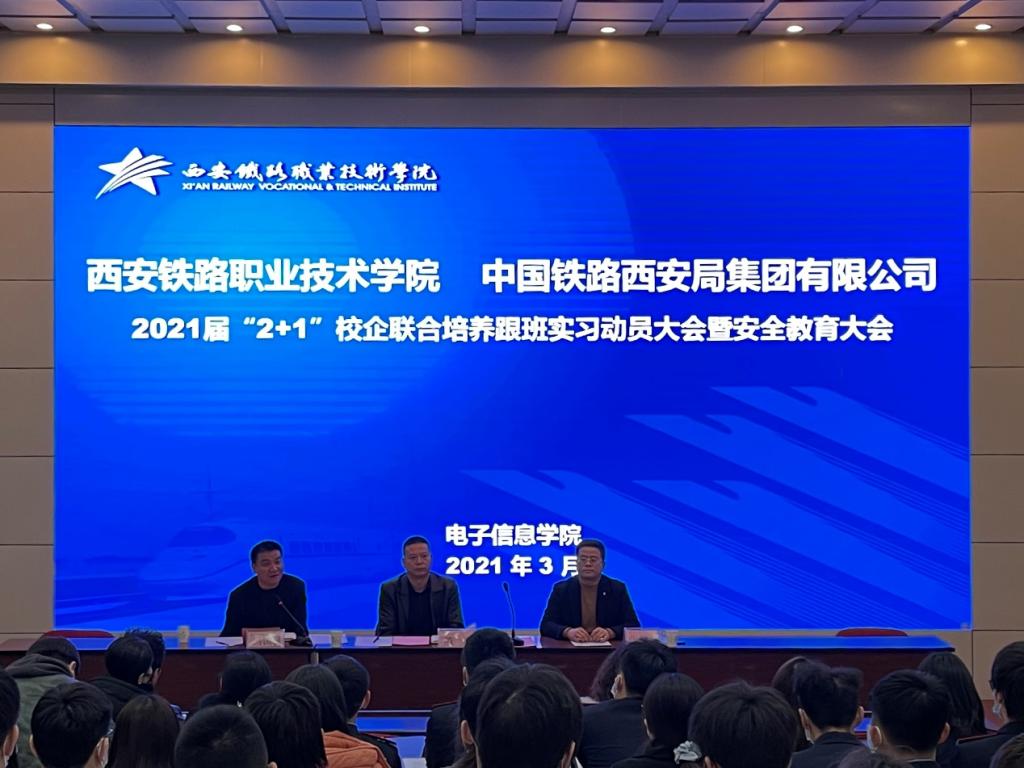 根据学校2月27日2021届中国铁路西安局集团有限公司2+1校企联合培养跟班实习工作协调会的会议精神,电子信息学院于3月1日在自强校区教学楼一楼阶梯教室召开了中国铁路西安局集团有限公司“2+1”校企联合培养跟班实习动员会暨安全教育大会。电子信息学院院长董奇、党总支书记张伟敏,两办负责人和相关指导教师、辅导员、班主任及实习学生共同参加大会。会议由电子信息学院副院长冯国良主持。