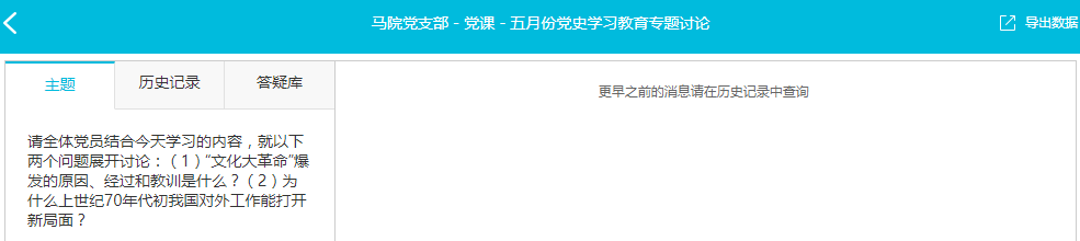 随后,全体党员在云班课上就““文化大革命”爆发的原因、经过”和“教训与上世纪70年代初我国对外工作能够打开新局面的原因”两个问题展开了讨论。