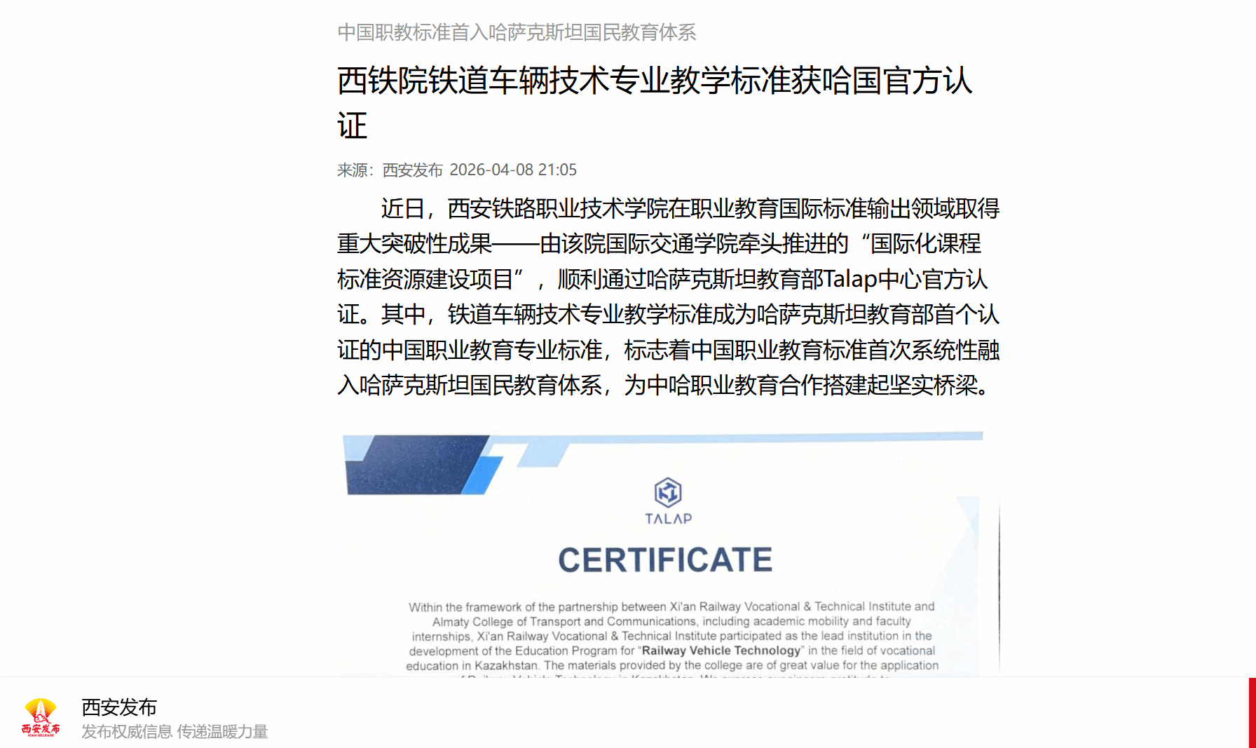 中国职教标准首入哈萨克斯坦国民教育体系 西铁院铁道车辆技术专业教学标准获哈国官方认证